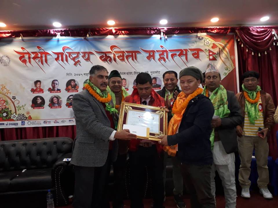 उदयपुर / राष्ट्रिय कबिता महोत्सवमा उदयपुरको जीवन आरोही प्रथम भएको छ । शनिबार नुवाकोट साहित्य प्रतिष्ठान नेपालले आयोजना गरेको दोस्रो राष्ट्रिय कविता महोत्सवमा आरोही प्रथम भएको हो ।