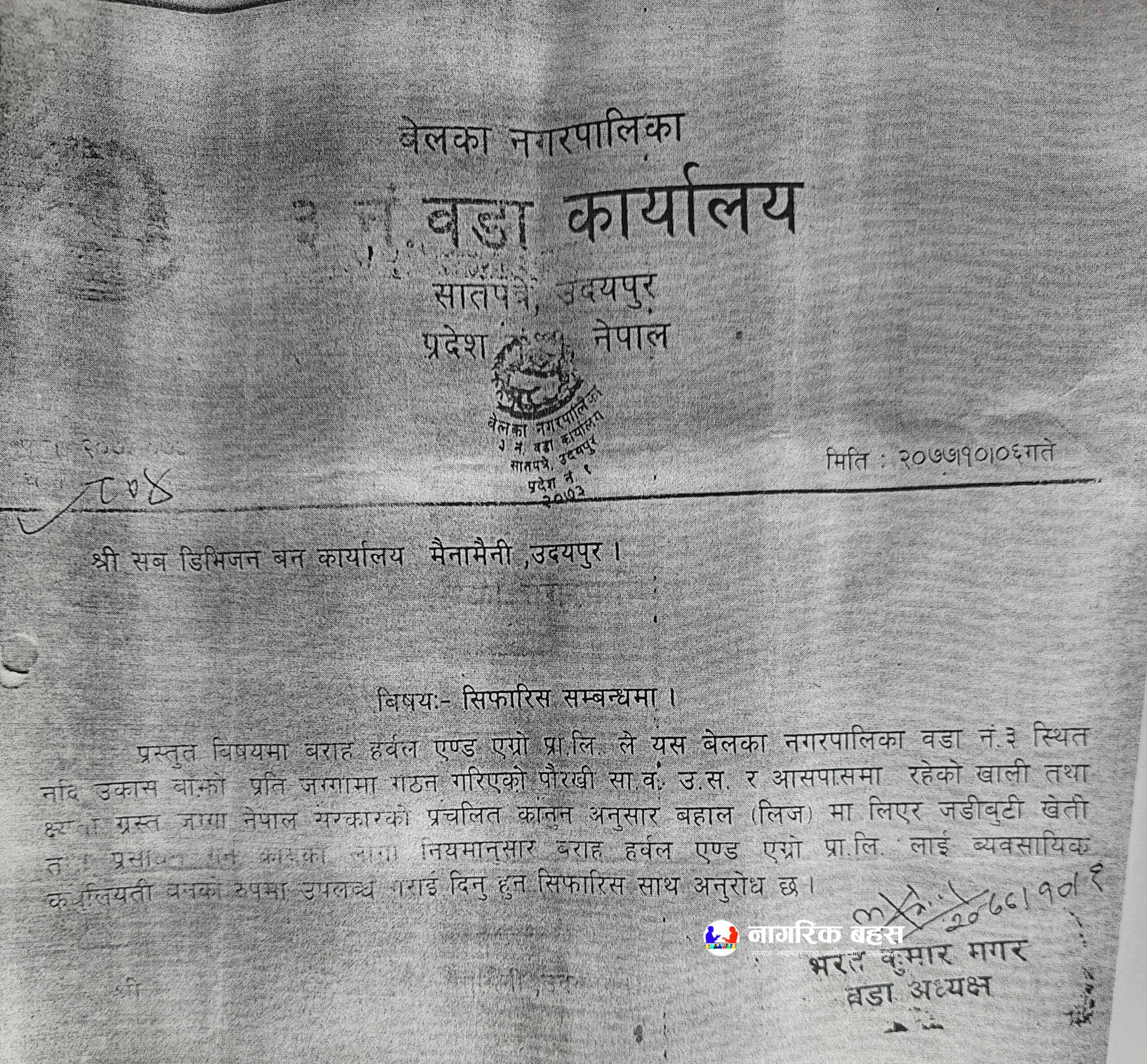 यता बेलका नगरपालिका ३ का वडाध्यक्ष भरत कुमार मगरले पनि २०७७ माघ ६ गते सव डिभिजन वन कार्यालय मैनामैनीलाई पत्र लेखेर बराह हर्बल एण्ड एग्रो प्रा.लि.लाई ब्यवसायिक कबुलियत वनको रुपमा उपलब्ध गराउन सिफारिस गरिएको देखिन्छ ।