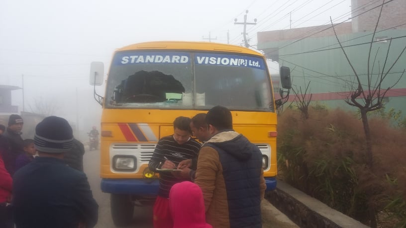 ढुंगा लागेर बसको अगाडीको सिसा फुटाएको प्रहरीले जानकारी दिएका छन् । प्रहरीका अनुसार अहिलेसम्म कसैलाई पक्राउ गर्न नसकेपनि चाँडै अपराधि पत्ता लाग्ने बताएका छन् । प्रहरीका अनुसार बसको सिसा फुटाउनेको खोजी भैरहेको जनाएको छ ।