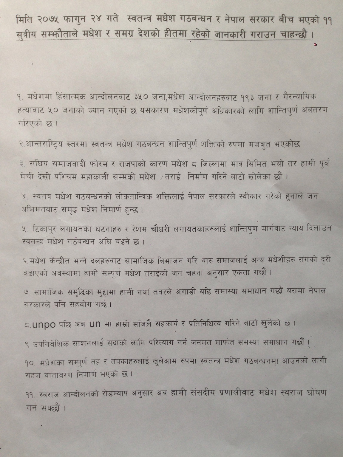 सरकार र गठबन्धन बीच ११ बुँदे सहमति भएपछि ‘रुपन्देही स्वतन्त्र मधेस गठबन्धन’ले निकालेको ११ बुँदे निश्र्कर्ष :