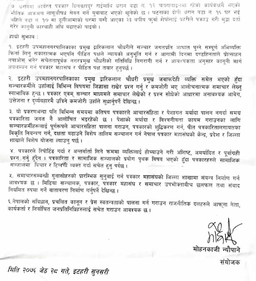 इटहरी र धरानमा भएका पत्रकारसँग सम्बिन्धत घटनाहरुको अध्ययन गरी रिपोर्ट पेश गर्न पत्रकार महासंघ प्रदेश १ कमिटीले जेठ २३ गते मोहनकाजी न्यौपानेको संयोजकत्वमा एउटा मिसन टोली गठन गरेको थियो । टोलीले मंगलबार प्रतिवेदन बुझाएको छ ।