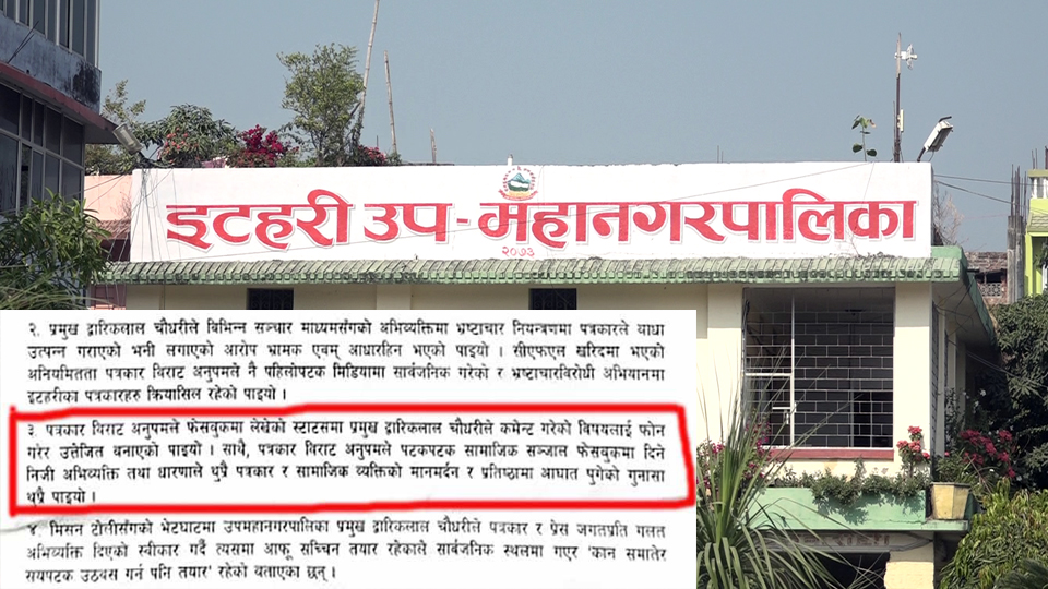 इटहरी । पत्रकार विराट अनुपम गौतमले इटहरीका मेयर द्वारिकलाल चौधरीलाई फोन गरेर उत्तेजित गराएको भन्दै नेपाल पत्रकार महासंघले पत्रकारको गल्ती औंल्याएको छ । महासंघको मिसनले मेयर चौधरीको समेत कमजोरी औंल्याएको छ ।
