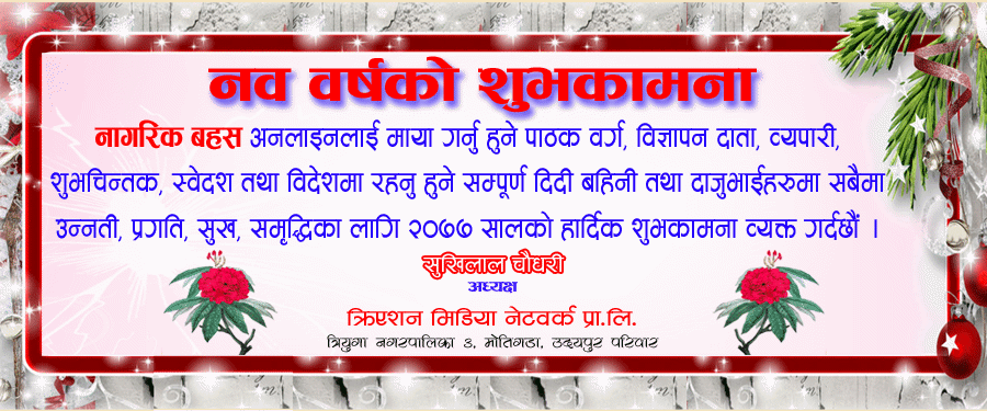 नयाँ बर्ष २०७७ को पावन अवसरमा हामी हाम्रा सम्पूर्ण पाठक र विज्ञापनदाताहरूको साथै सम्पूर्ण मान्यजन, स्वदेश तथा विदेशमा रहनुहुने आमाबुवा, दाजुभाई, दिदीबहिनी, शुभचिन्तक सबै नेपालीहरू रोग, शोक, महामारी, अभाव, अशान्ति र निराशाबाट मुक्त भई सुख, शान्ति र स्वस्थ रहुन् ! नागरिक बहस अनलाइन परिवारको तर्फबाट नयाँ वर्षको हार्दिक मङ्गलमय शुभकामना !