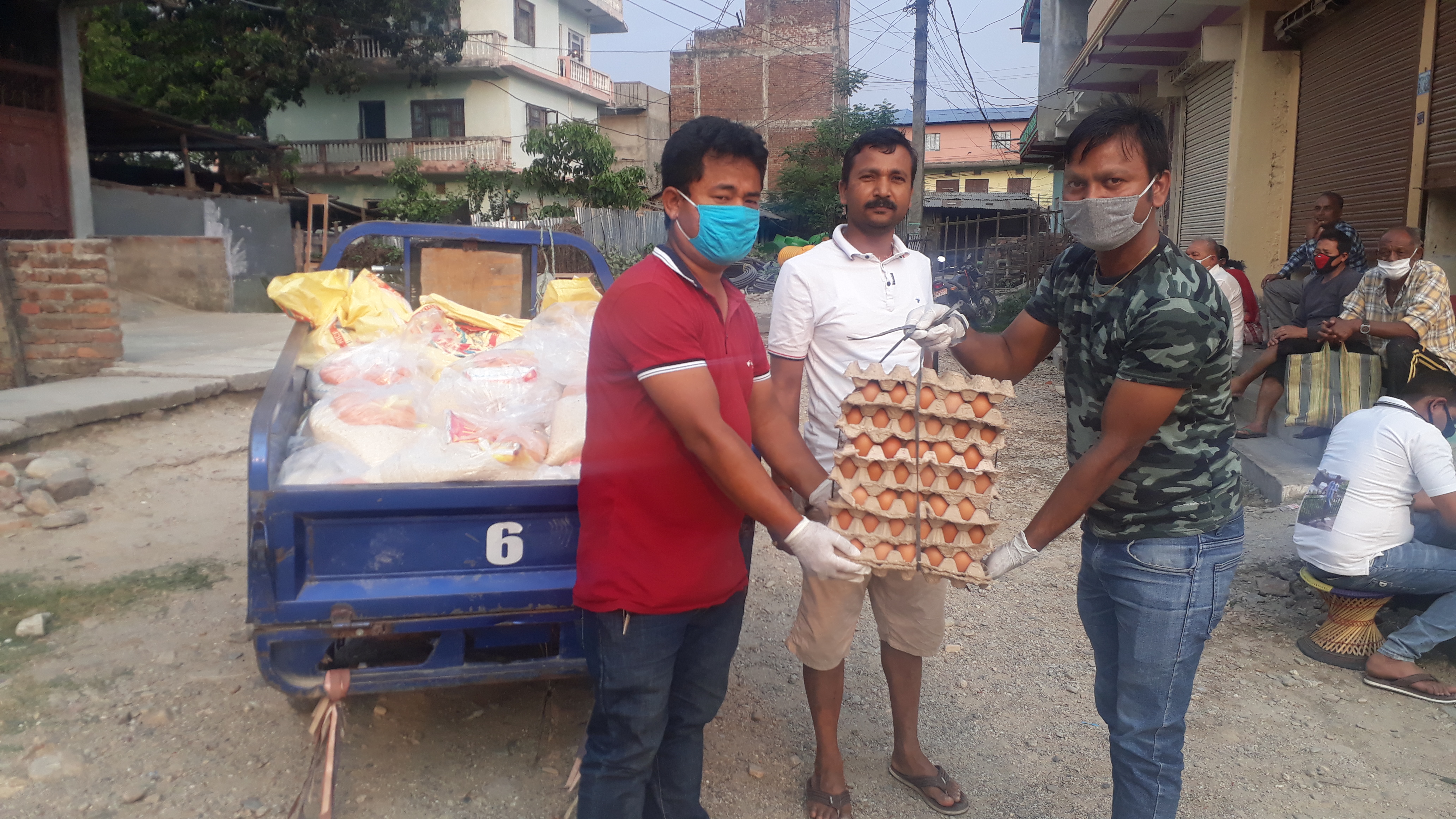 लक डाउनले असंगठित क्षेत्रमा दैनिक ज्यालादारी गरेर खाने मजदुरलाई समस्या परेको भन्दै त्रियुगा नगरपालिकाले बिभिन्न वडामा राहत बितरण गरि रहेको अवस्थामा सिद्धार्थ टोल बिकास सँस्थाले बितरण गरेको राहत सामाग्रीमा मनोज मासु पसलका मनोज गामीले निःशुल्क रुपमा १ काटुन अण्डा (२१० वटा) प्रति परिवार ६ वटाका दरले ३५ घर परिवारलाई उपलब्ध गराएको मनोज गामीले जानकारी दिए ।