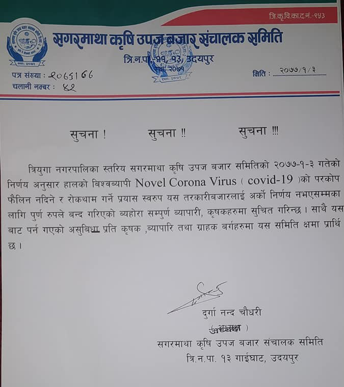 उदयपुरका सहायक प्रमुख जिल्ला अधिकारी भिमप्रसाद भट्टराईले हाट बजार तथा तरकारी बजारलाई बन्द गर्न यसअघि नै निर्णय गरेको बताए ।