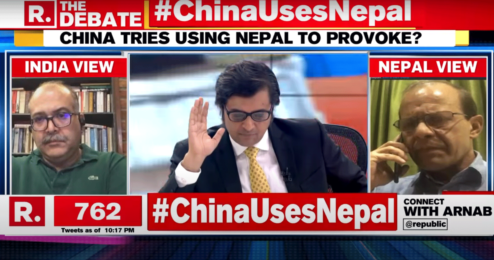 गोस्वामी पृष्ठभूमि जोड्दै रिजालमाथि प्रश्न सुरु गर्नु अगावै हावी हुन खोज्छन् – चीन कसैको पनि साथी हैन। अहिले विश्व समुदायमा एक्लै छ। यो विषयमा तपाईहरु पनि सचेत हुनुहुन्छ। भारतीय भूमीमा तपाईहरुको कुनै इन्ट्रेस्ट छ भने त्यो हास्यास्पद हुन्छ। यदी भारतीय सिमामा कर्के नजर लाउँदै हुनुहुन्छ भने, कहिल्यै पूरा नहुने सपना नदेख्नुस्। म मान्छु, तपाईहरु पनि एउटा महत्वपूर्ण देश हो। लिपुलेक हुँदै अहिले बनिरहेको बाटो भारतका लागि चिनियाँ गतिविधिमाथि नजर राख्ने महत्वपूर्ण प्वाइन्ट हो।
