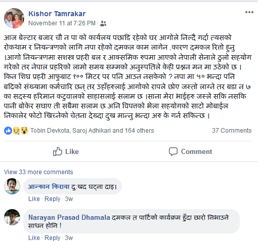 बेलका नगरपालिकाका मेयर दुर्गा थापाले आगलागीको घटना दुखद भएको भन्दै आगलागी नियन्त्रण गर्न सहयोग गर्ने सवैलाई फेसवुक स्टाटस लेख्दै धन्यवाद दिएका छन् । मेयर थापाको पोष्टमा उपेन्द्र थापा लेख्छन, ‘दुखद कुरा हो, अव एउटा दमकल लिनु पर्छ, नगरमा आफ्नै स्रोतसाधन हुँदा धेरै सजिलो हून्छ । हामीले नगरे कस्ले गर्ने अइले नगरे कैले गर्ने ।। हामी गर्छौ हाम्रै पालामा गर्छौ ।’ सरोज अधिकारी पनि मेयरले गरेको पोष्टमा कमेन्ट गरेका छन, ‘दमकल किन्न अनिवार्य देखिया मेयर ज्यू ।।’ बेलका नगरपालिकाका मेयरका प्रेस सल्लाहकार भरत घिमिरेले, ‘दमकल आवश्यक हो तर बजारमा दमकल छिर्ने बाटो छोइन । मापदण्ड विपरित बाटो छ । बजार भित्र २÷४ वटा बाटो छन, जहाँ भएका बाटो थुनिएको छ । रहेको बाटो कालिकाले विगारि दिएको छ भैरहेको बाटो मिचिएर साइकल समेत छिर्न गाह्रो छ ।’ भन्दै कमेन्ट गरेको छ ।