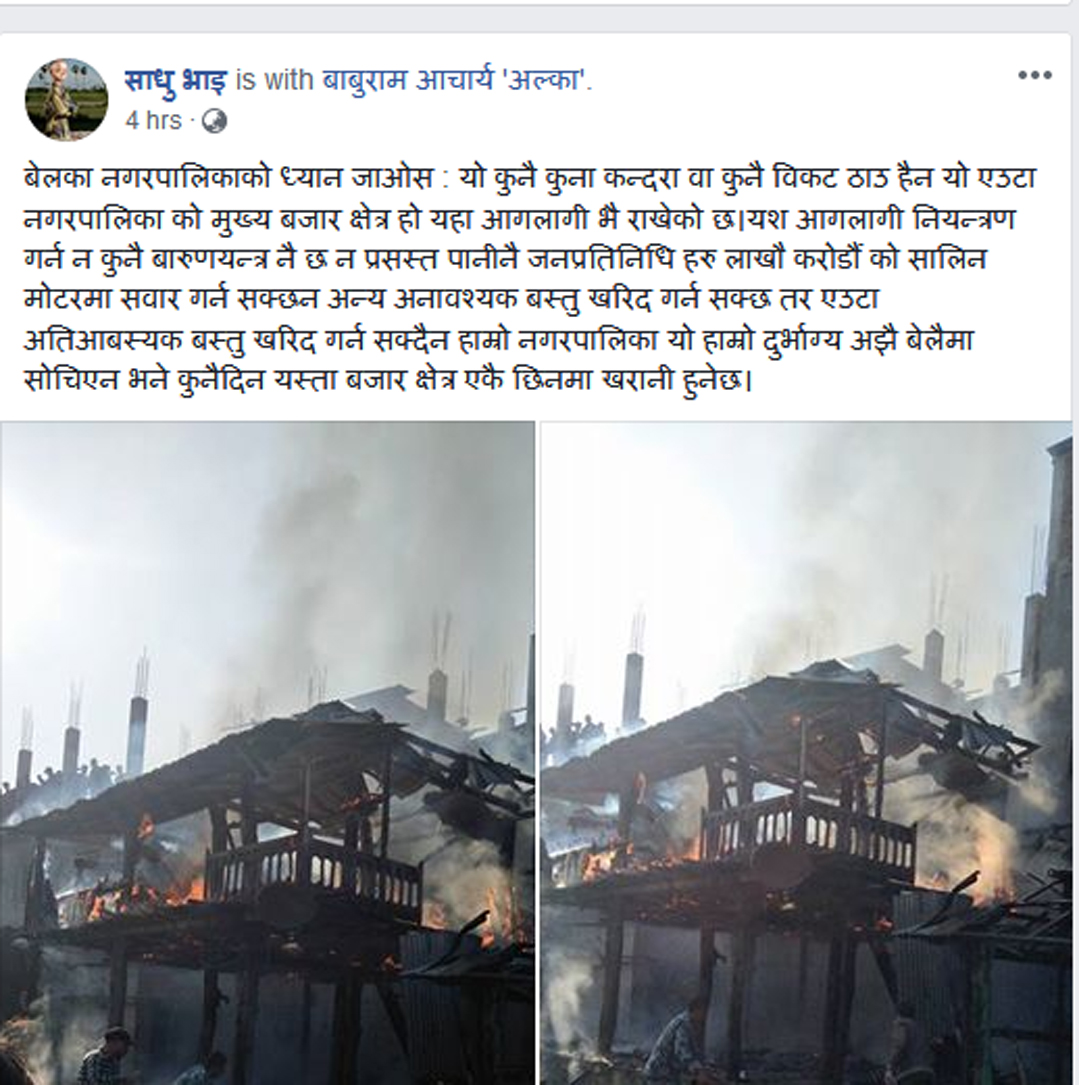 साधु भाईले फेसबुक स्टाटरमा लेखेका छन्, ‘बेलका नगरपालिकाको ध्यान जाओस : यो कुनै कुना कन्दरा वा कुनै विकट ठाउ हैन, यो एउटा नगरपालिकाको मुख्य बजार क्षेत्र हो, यहा आगलागी भै राखेको छ । यश आगलागी नियन्त्रण गर्न न कुनै बारुणयन्त्र नै छ, न प्रसस्त पानीनै जनप्रतिनिधिहरु लाखौ करोडौंको सालिन मोटरमा सवार गर्न सक्छन । अन्य अनावश्यक बस्तु खरिद गर्न सक्छ । तर, एउटा अति आबस्यक बस्तु खरिद गर्न सक्दैन । हाम्रो नगरपालिका, यो हाम्रो दुर्भाग्य, अझै बेलैमा सोचिएन भने कुनैदिन यस्ता बजार क्षेत्र एकै छिनमा खरानी हुनेछ ।’