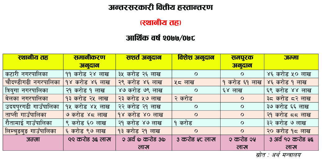 आगामी वर्षका लागि समानीकरण अनुदान तफै ९९ करोड ३६ लाख, सशर्त अनुदान तर्फ २ अर्व ७ करो ३७ लाख, विशेष अनुदान तर्फ ३ करोड ५८ लाख र समपुरक अनुदान तर्फ २ करोड २५ लाख विनियोजन गरेको छ ।