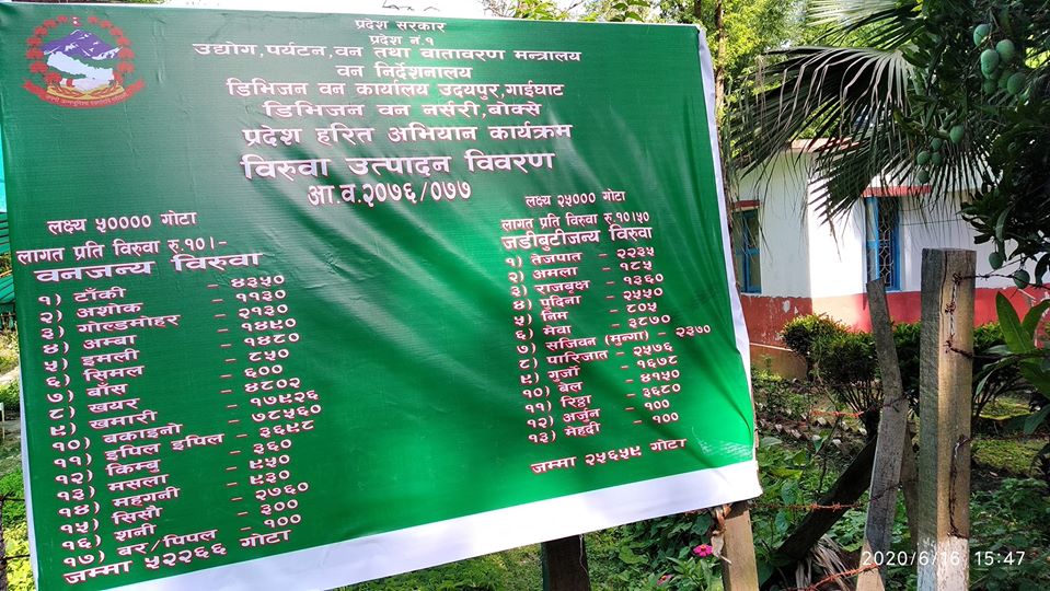 कार्यालयले गत असार २ गतेदेखि विरुवा समेत वितरणको काम शुरु गरेको डिभिजन वन कार्यालय गाईघाटका डिभिजन वन अधिकृत अम्बिका प्रसाद पौडेलले जानकारी दिए । ‘विभिन्न जातको विरुवाहरु उत्पादन गरेको छौं त्यसको वितरणको काम पनि शुरु गरिसहेका छौं’, उनले भने, ‘यसले प्रदेश हरित अभियान कार्यक्रमलाई सहयोग गर्ने अपेक्षा गरेका छौं, अहिले आधा जति विरुवा निःशुल्क भई सकेको छ ।’