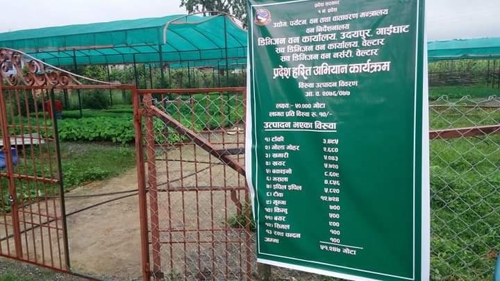 हरेक वर्ष विभिन्न प्रजातिका बिरुवा उत्पादन गरेर विभिन्न क्षेत्रमा निःशुल्क रूपमा वितरण गर्दै आइरहेको छ । तर हरेक वर्ष विभिन्न वन क्षेत्रमा डढेलो जाने र वस्तुभाउले खाइदिने हुँदा के कति बिरुवा संरक्षण भए भन्ने यकिन तथ्याङ्क छैन ।