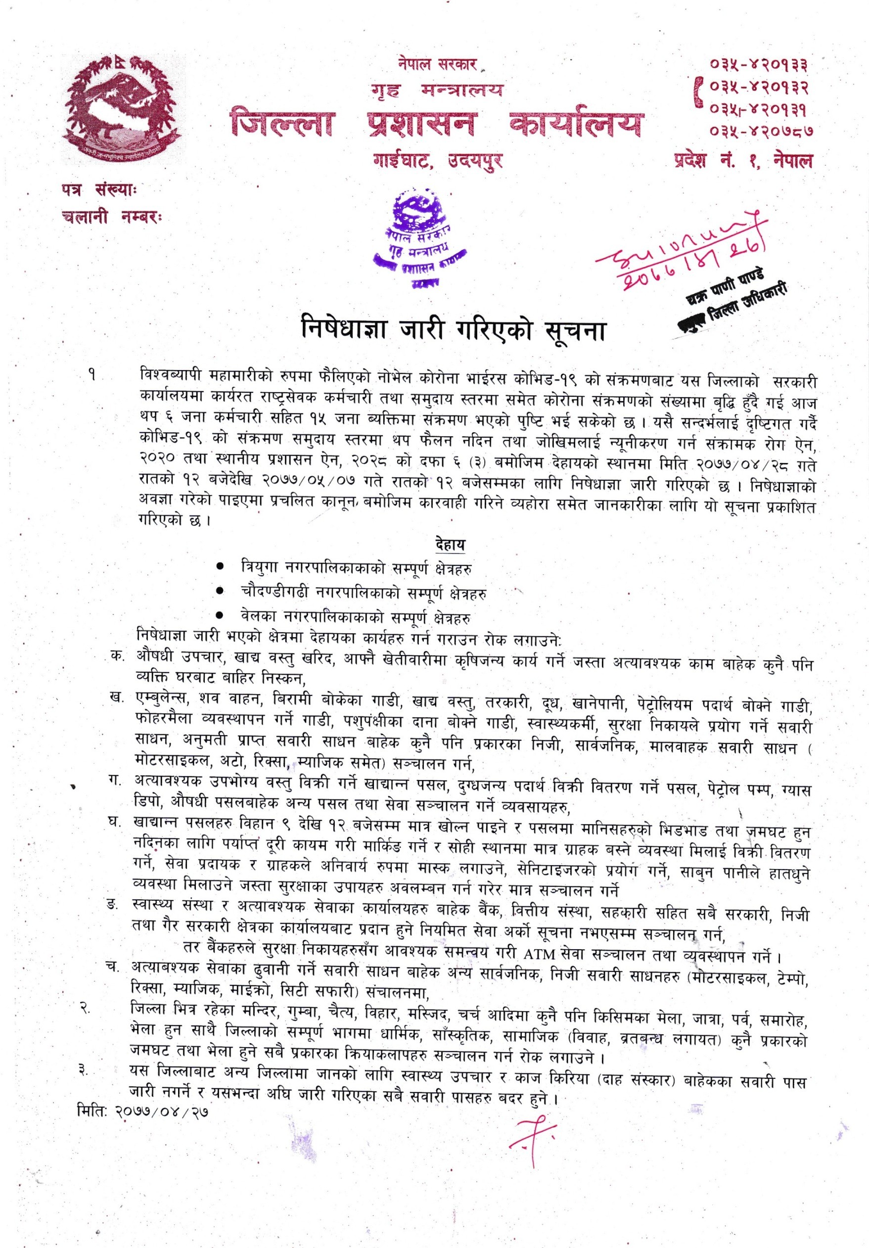 यी नगरपालिकामा अति आवश्यक काम बाहेको अन्य कामलाई निशेध गरिएको जिल्ला प्रशासन कार्यालय उदयपुरका प्रमुख जिल्ला अधिकारी चक्रपाणी पाण्डेले जानकारी दिए ।