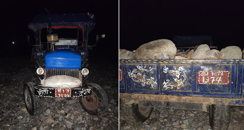 त्रियुगा नगरपालिका ११ स्थित बरुवा खोलामा रातको समयमा अवैध ढुंगा संकलन गरेको आरोपमा स १ त १९७४ नम्बरको ट्याक्टरलाई सशस्त्र प्रहरी बल नेपाल नं. ५ गण उदयपुरको सक्रियतामा नियन्त्रणमा लिएको सशस्त्र प्रहरी उपरीक्षक सुधिर सुवेदीले जानकारी दिए । उनका अनुसार गैरकानूनी रुपमा नदीजन्य पदार्थ उत्खन्न गर्ने कसैलाई नछोडने बताए ।