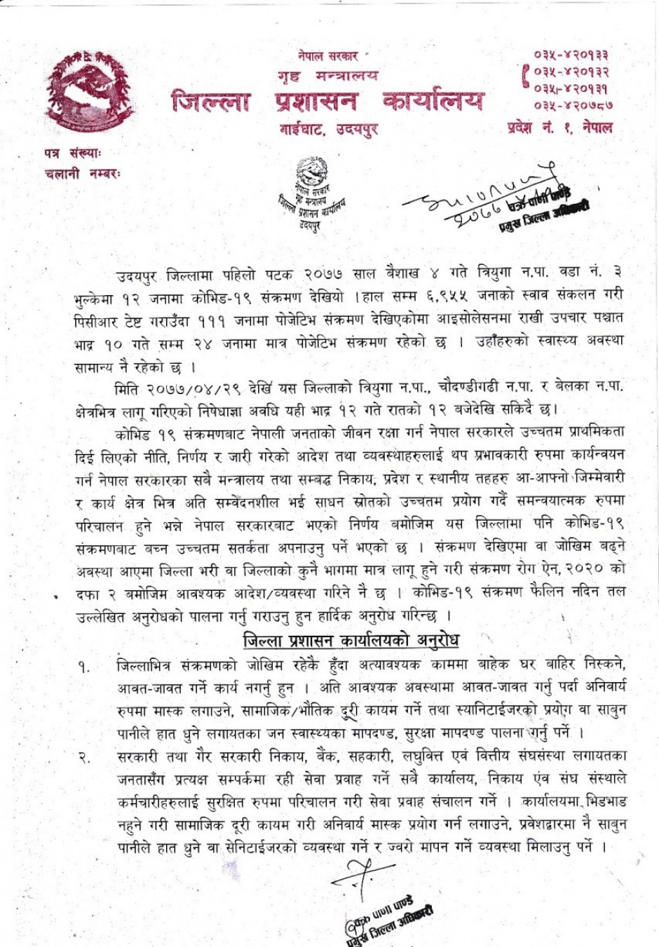 संक्रमितका सम्र्पकमा आएका व्यक्तिलाई निगरानीमा राख्ने र उनीहरुको पिसिआर परीक्षणलाई तिव्रता दिने भन्दै प्रशासनले पहिलोपटक १० दिन र दोश्रोपटक भदौ ७ देखि १२ गतेसम्म पाँच दिनका लागि निषेधाज्ञा गर्ने निर्णय गरेको थियो ।