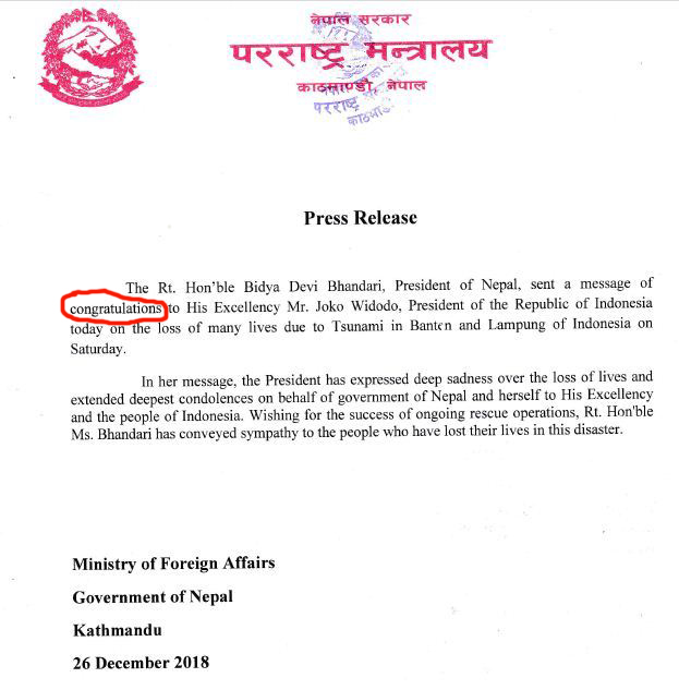 गल्ति भएको विषयमा यतिखेर सामाजिक संजालमा चर्को आलोचना भएको छ । परराष्ट्र मन्त्रालयले जारी गरेको उक्त विज्ञप्तिमा गम्भीर त्रुटि फेला परेको हो । अंग्रेजी भाषामा पठाइएको विज्ञप्तिमा सुनामीका कारण धनजनको क्षति भएकोमा इण्डोनेसियाका राष्ट्रपति जोको विडोडोलाइ बधाई भनेर लेखिएको छ ।