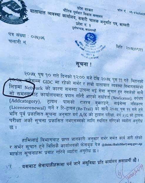 काठमाडौं / परराष्ट्र मन्त्रालयको सुनामीमा बधाई काण्ड सेलाउन नपाउँदै यातायात व्यवस्था कार्यालयमा यस्तै, ‘लिङ्गमा नेटवर्क समस्या’ पत्र सामाजिक संजालमा भाईरल भईरहेको छ । प्रदेश सरकार भौतिक पूर्वाधार विकास मन्त्रालय यातायात व्यवस्था कार्यालय, सवारी चालक अनुमति पत्र बागमतिको पत्रमा ‘लिङ्गमा नेटवर्क समस्या’ यस्तो त्रुटिपूर्ण शब्द लेखेको भेटिएको छ । मिति २०७५÷०९÷११ गतेको सूचनामा ‘यातायात व्यवस्था विभागसम्मको लिङ्गमा नेटवर्कको कारण समस्या उत्पन्न भई सेवा सूचारु हुन नसकेको’ व्यहोराको सूचना प्रकाशित भएको छ । ‘लिंकमा नेटवर्कको कारण समस्या उत्पन्न भई सेवा सूचारु हुन नसकेको’ व्यहोराको पत्र हुनु पर्नेमा लिङ्गमा नेटवर्कको समस्या सूचना प्रकाशित भएको छ । यो पत्र अहिले सामाजिक संजालमा भाईरल भैरहेको छ ।