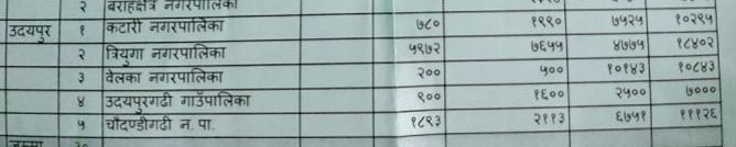 उदयपुरको आठ स्थानीय तहमध्ये पाँच स्थानीय तहका ५७ हजार ६ सय ६६ घर परिवार भूमिहिन दलित, सुकुम्बासी र अव्यवस्थित बसोबासी नागरिकलाई लालपुर्जा वितरण गर्ने छन् । जिल्लाको आठ पालिका मध्ये कटारी, त्रियुगा, बेलका, चौदण्डीगढी नगरपालिका र उदयपुरगढी गाउँपालिकाका ५७ हजार ६ सय ६६ नागरिकलाई लालपुर्जा वितरण गर्ने छन् ।