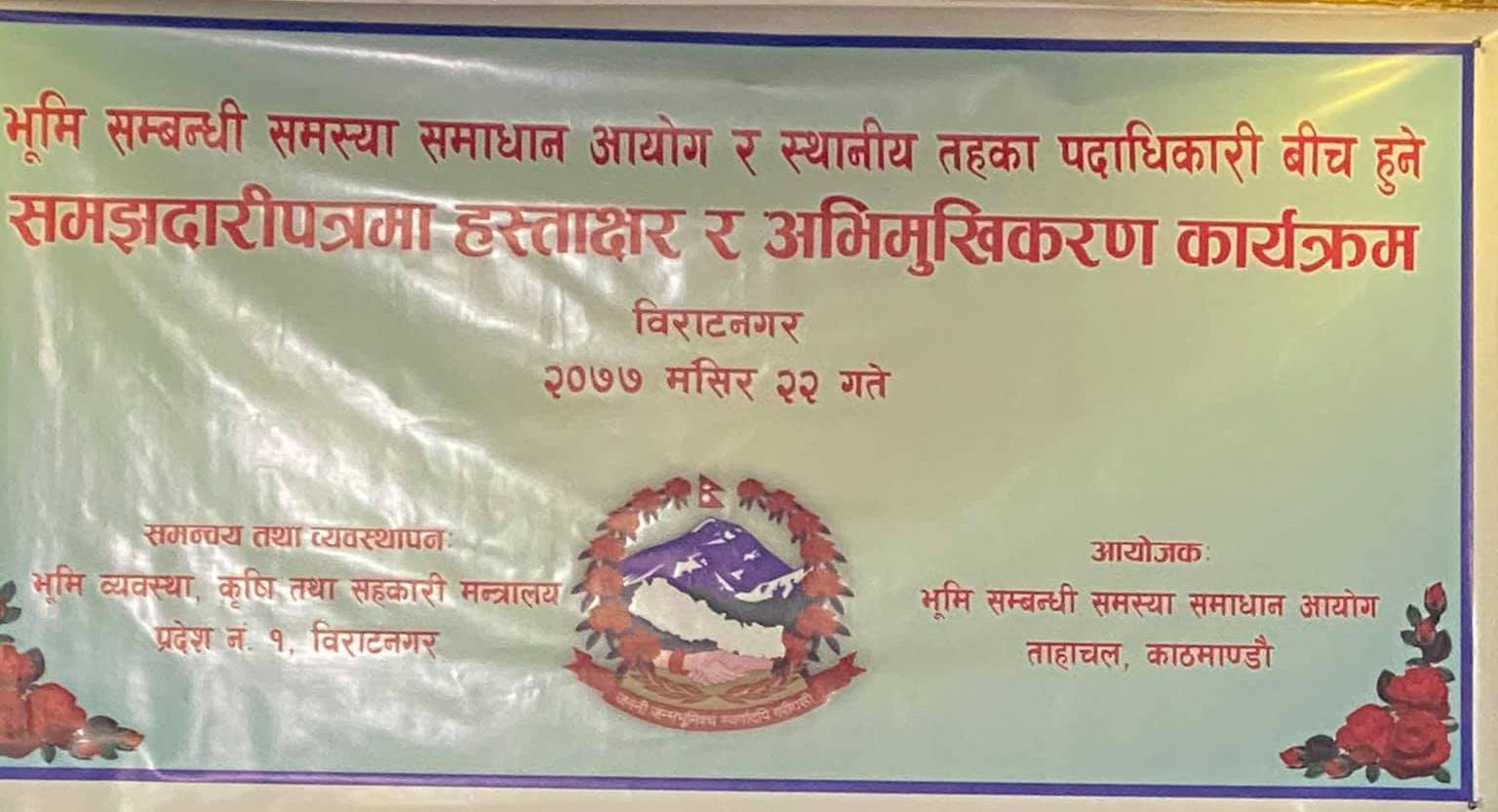 उदयपुर । भूमि सम्बन्धि समस्या समाधान आयोगले उदयपुर सहित प्रदेश १ का ९ जिल्लाका ३० वटा स्थानीय तहका एक लाख नागरिकलाई लालपूर्जा वितरण गर्ने प्रक्रिया अगाडी बढाएको छ । आयोगले सोमबार प्रदेश नं. १ का मुख्य मन्त्री शेरधन राईको प्रमुख आतिथ्यतामा ३० स्थानीय तहका प्रमुखसँग कार्य सम्पादन सम्झौता गर्दै एक लाख घरपरिवार भूमिहिन दलित, सुकुम्बासी र अव्यवस्थित बसोबासी नागरिकलाई लालपूर्जा उपलब्ध गराउने प्रक्रिया अगाडी बढाएको हो ।