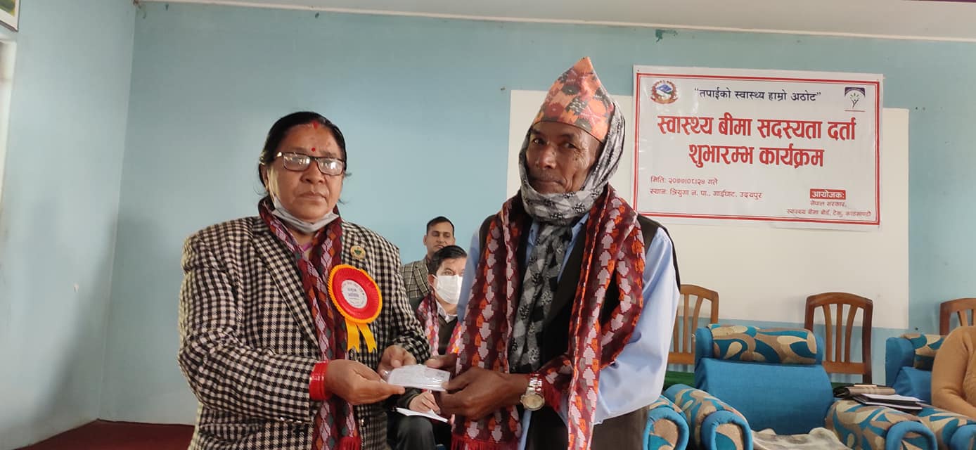 कार्यक्रममा प्रदेश सांसद अम्बिका थापाले उदयपुरका जेष्ठ नागरिक भुवानसिंह श्रेष्ठलाई वीमा परिचयपत्र हस्तान्तरण र गमलाको फुलमा पानी लगाएर उद्घाटन गरिन् । लगत्तै सांसद थापालाई वीमा वोर्डका कार्यकारी निर्देशक दामोदर निरौलाले वीमा कार्यक्रममा आवद्द भएको परिचयपत्र दिए ।