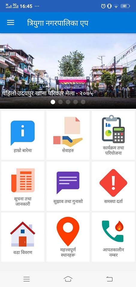 उदयपुर / त्रियुगा नगरपालिकाले नगरपालिकाकासबै सुचनाहरु एकै ठाउँबाट हेर्न सकिने गरि मोवाइल एप्स विहिबारबाट संचालनमा ल्याएको छ । मोवाइल एप्सबाट नगरपालिकाका सूचना, जानकारी, परियोजनाबारे जानकारी प्रशासनिक तथा आर्थिक गतिविधी मोवाइल मै हेर्न सकिने गरि नगरपालिकाले एप्स निर्माण गरेर सार्वजनिक गरेको हो ।