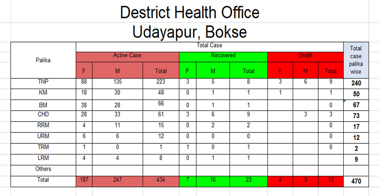 जिल्लामा अहिलेसम्म ४७० जनामा कोरोना देखिएको जिल्ला स्वास्थ्य कार्यालय उदयपुरको तथ्याङ्कले देखाएको छ । कोरोना देखिएको मध्ये ४३४ जना सक्रिय संक्रमित अर्थात उपचाररत संख्या छन् भने २३ जना कोरोनामुक्त भएका छन । कोरोनाबाट १३ जनाको मृत्यु भएको छ ।