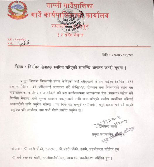 मंगलबार एक सूचना जारी गर्दै अतिआवश्यक (स्वास्थ्य) सेवा बाहेक सम्पूर्ण नियमित सेवाहरु अर्को सूचना जारी नहुन्जेलसम्मको लागि बन्द गर्ने निर्णय गरिएको प्रमुख प्रशासकिय अधिकृत रामचन्द्र लामाले जानकारी दिए ।