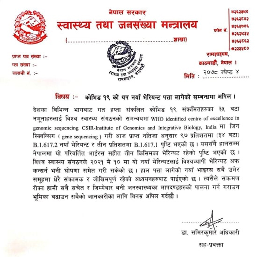 यो नयाँ भेरियन्टलाई विश्व स्वास्थ्य संगठनले सन् २०२१ मे १० मै विश्वव्यापी भेरियन्ट अफ कन्सर्न घोषणासमेत गरेको मन्त्रालयले बताएको छ ।