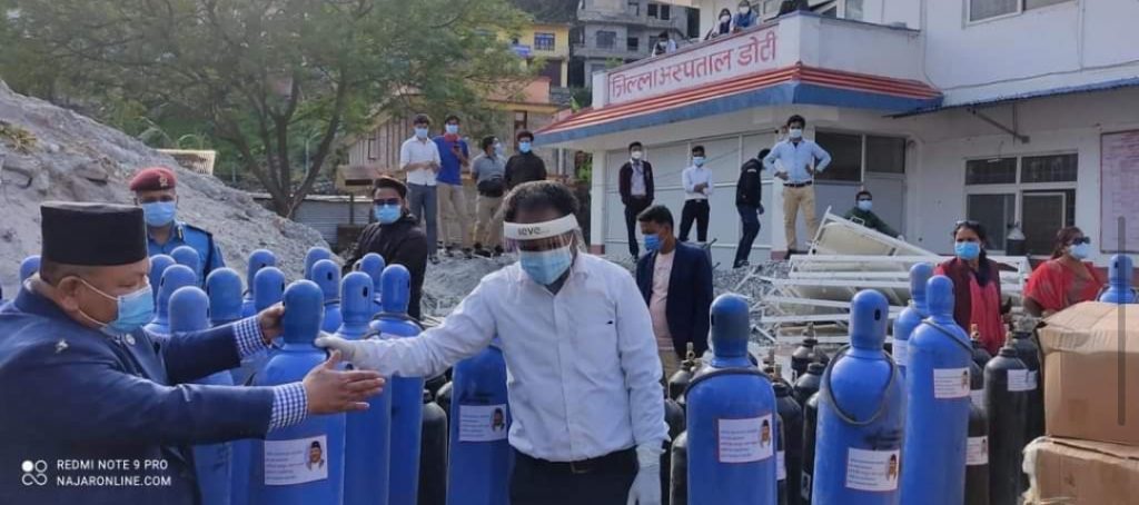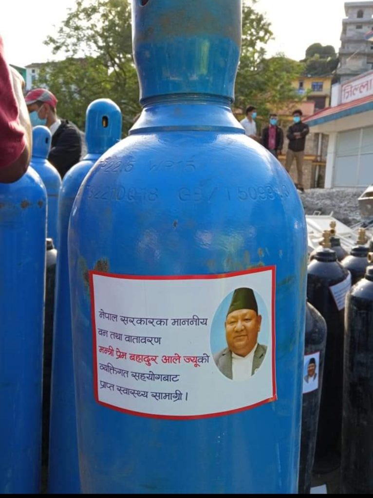काठमाडौं । वन तथा वातावरण मन्त्री प्रेम बहादुर आलेले डोटी जिल्लामा स्वास्थ्य सामग्री वितरण गरेका थिए । वितरण गरिएको स्वास्थ्य सामग्री मध्ये चिन सरकारबाट अनुदानमा प्राप्त अक्सिजन सिलिण्डरमा मन्त्रीले आफ्नो फोटो सहित वितरण गरेको खुलाशा भएको छ ।