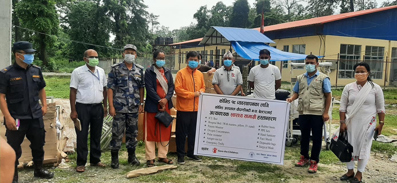 उदयपुर । चौदण्डीगढी नगरपालिका ६ बेल्टार, सातधारेमा रहेको जिल्लाकै एक मात्र कोभिड १९ अस्पताल “उदयपुर कोभिड १९ अस्पताल” बेल्टारलाई सेभ द चिल्ड्रेन उदयपुरले स्वास्थ्य सामग्री सहयोग गरेको छ । सोमबार एक कार्यक्रमका बिच चौदण्डीगढीका मेयर प्रमुख खगेन्द्र राई, उपमेयर रिताकुमारी चौधरी, नगर स्वास्थ्य शाखा प्रमुखको उपस्थितिमा सेभ द चिल्ड्रेनले १८ लाख भन्दा बढी मूल्य बराबरको स्वास्थ्य सामाग्री हस्तान्तरण गरेका थिए ।