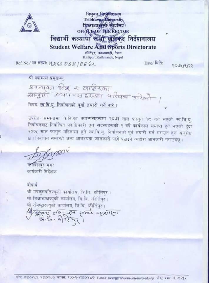 त्रिविका क्याम्पसहरुमा २०७३ साल फागुन १८ गते भएको स्ववियु निर्वाचनबाट निर्वाचित पदाधिकारी एवं सदस्यहरुको दुई वर्षे कार्यकाल सम्पत हुने भएको हुँदा २०७५ फागुन महिनामा हुने स्ववियु चुनावको पूर्व तयारी गर्न गराउन अनुरोध गरेको हो ।