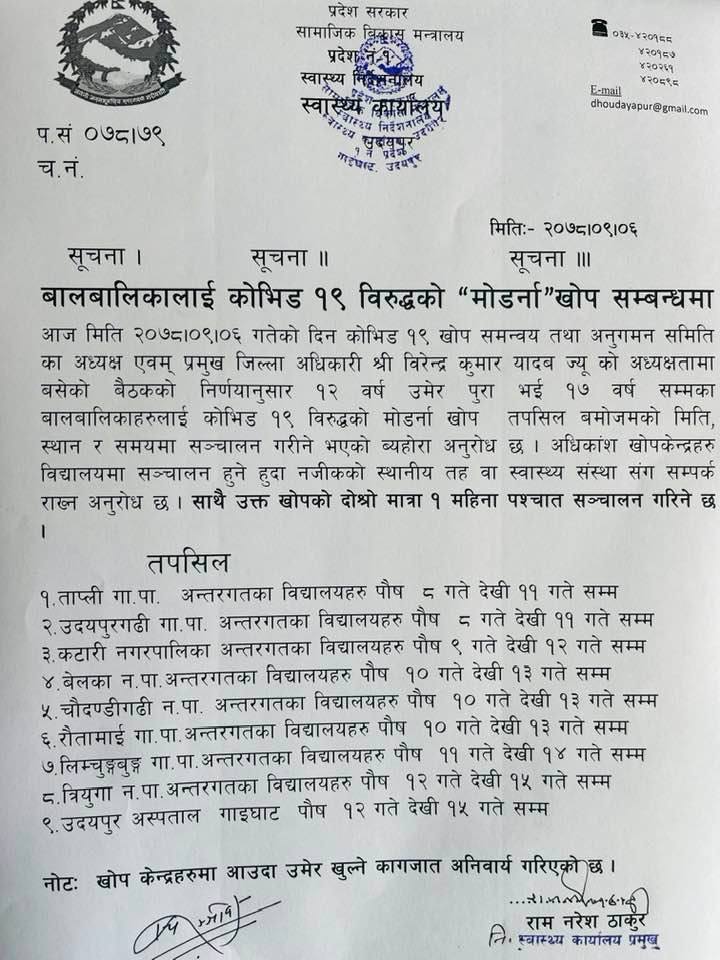 मंगलबार बसेको जिल्ला कोभिड १९ खोप समन्वय तथा अनुगमन समितिको संयोजक तथा प्रमुख जिल्ला अधिकारी विरेन्द्र कुमार यादवको अध्यक्षतामा बसेको बैठकले उदयपुरमा पुस ८–१५ गतेसम्म ४२ हजार बालबालिकालाई लक्षित गरी खोप अभियान संचालन गरिनेछ । २८ दिनको फरकमा लगाइने मोडर्ना खोप १२ देखि १७ वर्षसम्म उमेरका बालबालिकालाई लगाइने स्वास्थ्य कार्यालय उदयपुरका खोप सुपरभाइजर तथा सूचना अधिकारी चिरन्जिवी निरौलाले जानकारी दिए । उनले खोप सुरक्षित रहेको र ९४ प्रतिशत प्रभावकारिता रहेको बताए । खोपको दोस्रो डोज एक महिना पश्चात संचालन गरिने निरौलाले जानकारी दिए ।