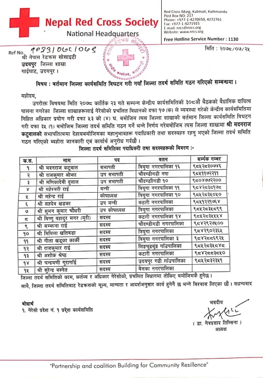 नेपाल रेडक्रस सोसाइटी केन्द्रले सभापतिमा मदनराज कटुवाल, उपसभापतिहरुमा राजकुमार ओझा, मणिकादेवी दुलाल र मन्त्रीमा महेश्वरी राईलाई ठाडो न्युक्ति दिएका थिए । यस्तै कोषाध्यक्षमा महेन्द्र राई, उपमन्त्रीमा सहदेव खडका र उप कोषाध्यक्षमा सुमन कुमार चौधरीलाई नियुक्त गरेर पठाएको थियो । त्यसैगरी सदस्यहरुमा विष्णु बहादुर मगर (मुरी), सम्झना राई, मिथिला खतिवडा, गीता खड्का कार्की, राजकुमार राई, अशोक श्रेष्ठ, चन्द्रमणी गुरागाई र सुरेन्द्र बस्नेत समेत १५ जनालाई ठाडो नियुक्ती दिएर पठाएको थियो ।