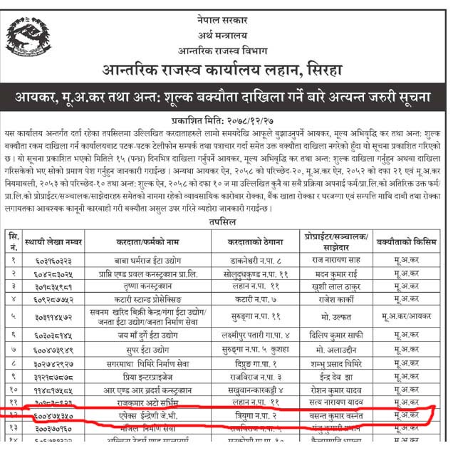 प्रोपाइटर बस्नेतले आन्तरिक राजस्व कार्यालय लहानमा कर चुक्ता गर्न बाकी रहेकाले निजको उम्मेदवारी खारेजी गर्न भन्दै उजुरी आएको मुख्य निर्वाचन अधिकृतको कार्यालयले जनाएको छ । राउतको उजुरीमा भनिएको छ ‘स्थानीय निर्वाचन ऐनको दफा १४ (२) बमोजिम गरि १४ (१) अनुसार उम्मेदवारी रद्द गरिपाउ ।’