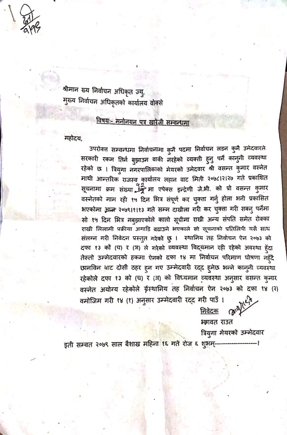 नेपाली काँग्रेसको तर्फबाट मेयर पदको उम्मेदवार बनेका बसन्त बस्नेतलाई भने मतदान हुने ११ दिन अघि उम्मेद्वारी खारेजीको माग गर्दै उजुरी परेको छ । निर्वाचन कानुन र स्वघोषणा विपरित ठूलो परिणाममा भ्याट तिर्नु पर्ने भेटिएको भन्दै एमालेबाट मेयर पदका उम्मेदवार बनेका भागबत राउतले बस्नेतको उम्मेद्वारी खारेजको माग गरेका छन । निर्माण व्यवासायी समेत रहेका बस्नेतले एपेक्स इन्द्रेणी जे.भि को नामबाट कारोवार गर्दा मूल्य अभिवृद्धिकर भ्याट बक्यौता रहेकाले बस्नेतको उम्मेद्वारी खारेजी हुनु पर्ने माग गरिएको छ । सोमबार मुख्य निर्वाचन कार्यालय उदयपुरमा एमाले उम्मेद्वार राउतले उजुरी दर्ता गराएका छन ।