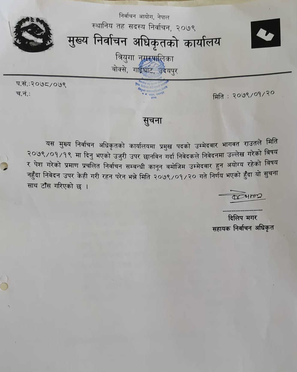 सोमबार एमालेका उम्मेद्बार भागवत राउतले मुख्य निर्वाचन अधिकृतको कार्यालय गाईघाटमा दिएको उजुरी मंगलबार माथि छानबिन गर्दा प्रचलित निर्वाचन सम्बन्धी कानून बमोजिम उम्मेदवार हुन अयोग्य रहेको बिषय नहुँदा निवेदन उपर केही गरी रहन परेन भन्दै सूचना एक सूचना मार्फत जानकारी गराएको छ ।