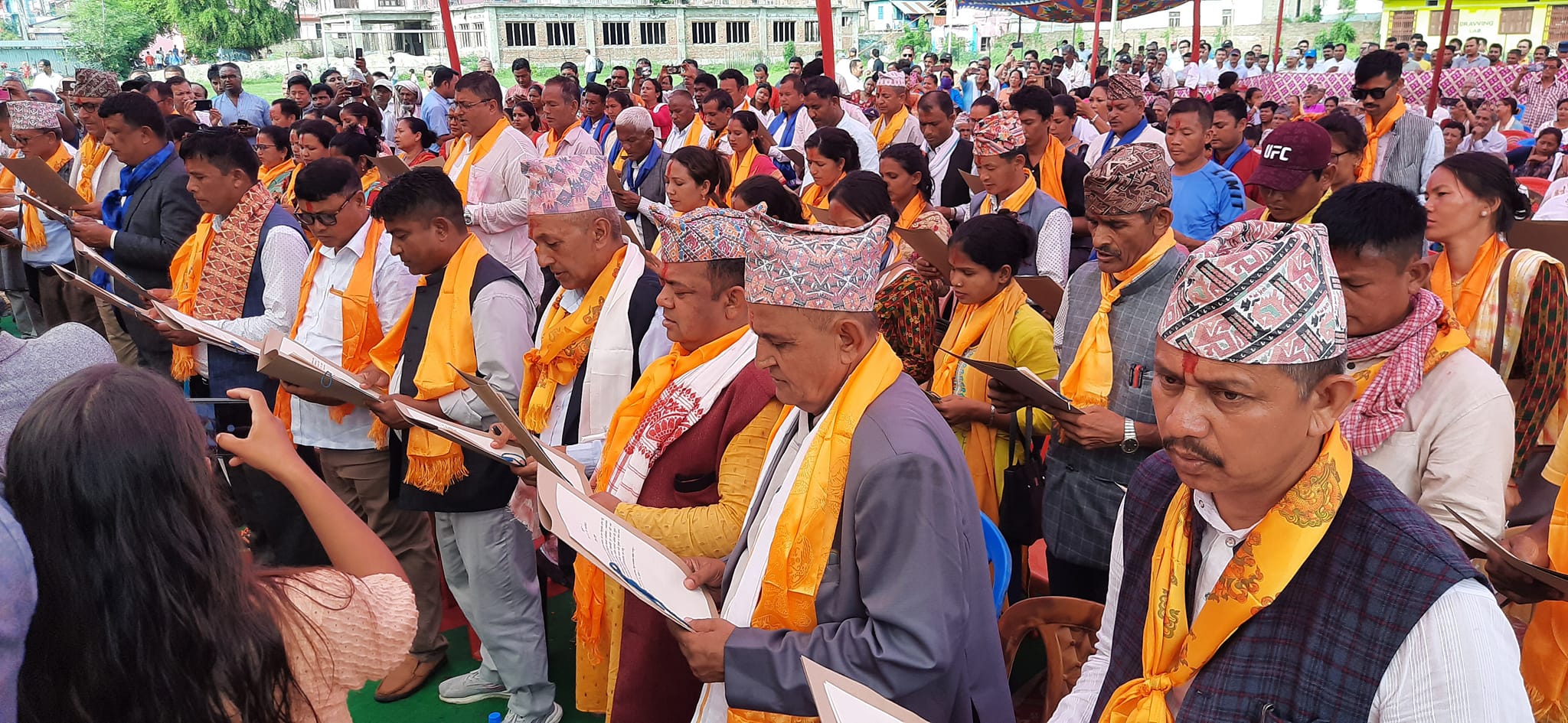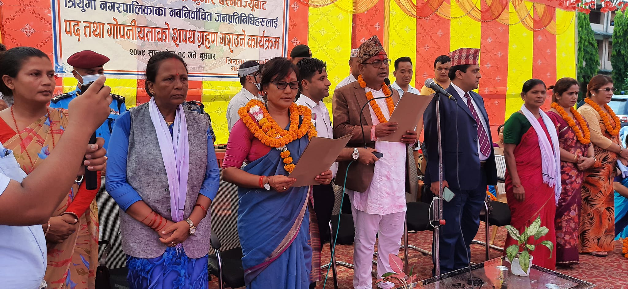 गाईघाट । त्रियुगा नगरपालिकाका सबै जनप्रतिनिधिहरुले सपथ लिएको छ । बुधबार नवनिर्वाचित मेयर बसन्त कुमार बस्नेत सहित उपमेयर, वडाअध्यक्ष तथा सदस्यहरु सबैले सपथ लिएको हो । मेयर वस्नेतले बोक्से स्थित कर्मचारी मिलन केन्द्रमा सपथ लिए भने उममेयर महेश्वरी राई लगायत वडाअध्यक्ष सदस्यहरुले त्रिउमावीको प्रांगनमा सपथ लिए । वस्नेतलाई उदयपुर जिल्ला अदालतका न्यायधिश उत्तम सिलुवालले सपथ खुवाए भने उपमेयर वडाअध्यक्षहरुलाई भने मेयर वस्नेतले सपथ खुवाए ।