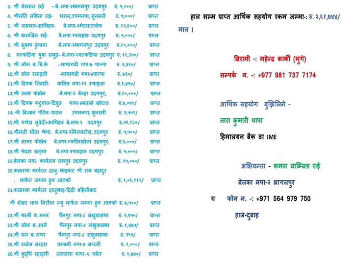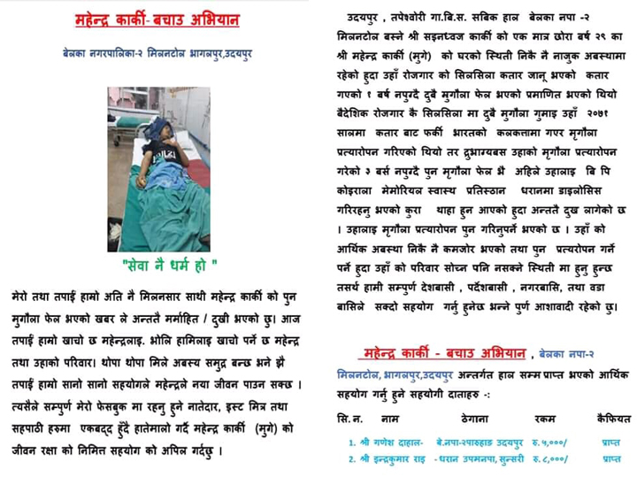 यस्तै मृगौला रोगी बेलका नगरपालिका निबासी महेन्द्र कार्कीको लागि महेन्द्र कार्की बचाउँ अभियान संचालन गरि देश बिदेशबाट ३ लाख सात हजार ४४ रुपैया आर्थिक सहयोग संकलन गरेर पीडित कार्कीलाई प्रदान गरिएको उनले बताए ।