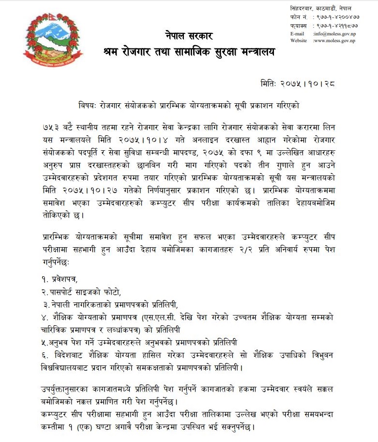 काठमाडौँ । श्रम, रोजगार तथा सामाजिक सुरक्षा मन्त्रालयले रोजगार संयोजकको छोटो सूची सार्वजनिक गरेको छ। सोमबार राति मन्त्रालयले एक पदका लागि तीन जनाको नाम छोटो सूचीमा समावेश गरी सार्वजनिक गरेको हो । मन्त्रालयले प्रदेश अनुसार छोटो सूचीमा पर्ने उम्मेदवारको नाम सार्वजनिक गरेको छ । सबै उम्मेदवारको सीप परीक्षा भने पुल्चोक इन्जिनियरिङ कलेजमा हुने मन्त्रालयले जनाएको छ । परीक्षा फागुनको ११ र १२ गते हुने पनि मन्त्रालयले जनाएको छ ।