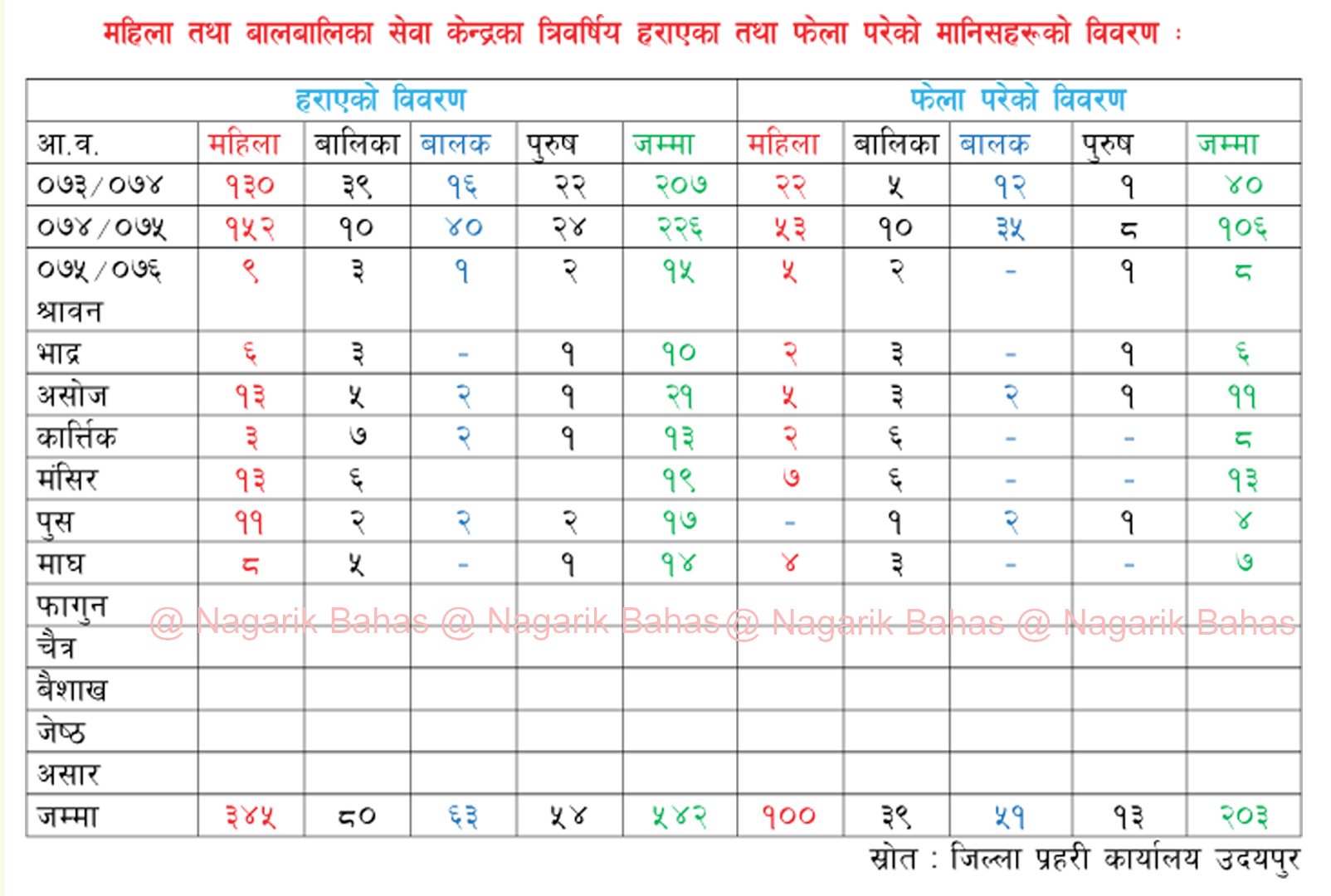 सुखिलाल चौधरी, उदयपुर, उदयपुरमा महिला तथा बालबालिका हराउनेको संख्या डर लाग्दो देखिएको छ । दुई वर्ष नौ महिनाको तथ्याङ्क अनुसार अहिलेसम्म २ सय ४५ जना महिला, ४१ जना बालिका र १२ जना बालक गरी २ सय ९८ जना हराएको देखिन्छ ।