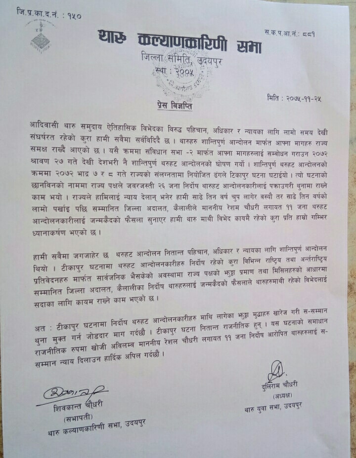 उदयपुर । थारु समुदायमाथि राज्यको विभेद भएको भन्दै थारु कल्यणकारिणी सभा उदयपुरले विरोध जनाएको छ । शनिबार एक विज्ञप्तीमार्फत आदिवासी थारु समुदायमा ऐतिहासिक विभेदका विरुद्ध पहिचान, अधिकार र न्यायका लागि लामो समयदेखि संघर्षरत रहेको अवस्थामा टिकापुरमा दुखद घटना हुन पुग्यो । राजनीतिक घटनालाई तोडमोड गरेर झुठ्ठो प्रमाण तथा मिसिलहरुको आधारमा रेशम चौधरी लगायत ११ माथि जन्म कैदको सजयप्रति थारु कल्याकारिणी सभा उदयपुरले घोर भत्र्सना गरेको छ ।