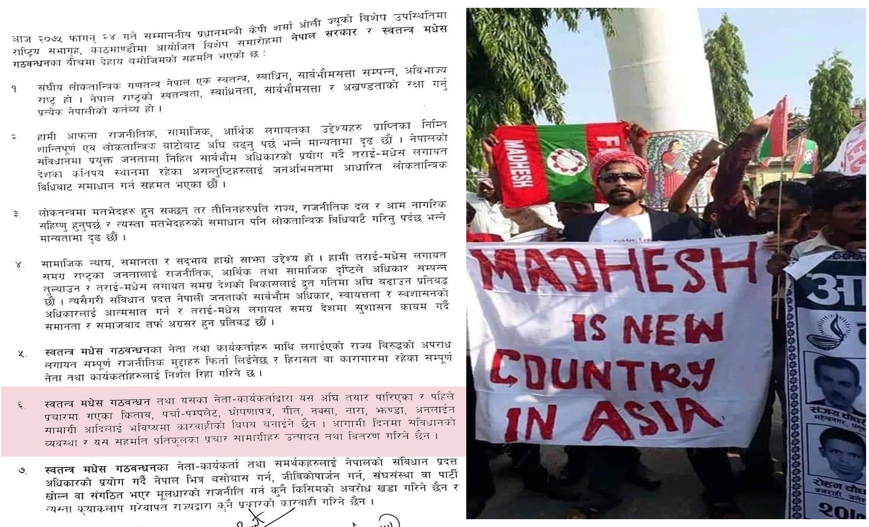 साथै बुँदा नम्बर ६ मा भनिएको छ, ‘स्वतन्त्र मधेस गठबन्धन तथा यसका नेता कार्यकर्ताद्वारा यसअघि तयार पारिएका र पहिले प्रचारमा गएका किताब, पर्चा पम्पलेट, घोषणापत्र, गीत, नक्सा, नारा, झण्डा, अनलाइन सामाग्री आदिलाई भविष्यमा कारबाहीको विषय बनाइने छैन । आगामी दिनमा संविधानको व्यवस्था र यस सहमति प्रतिकुलका प्रचार सामाग्रीहरु उत्पादन तथा वितरण गरिने छैन ।