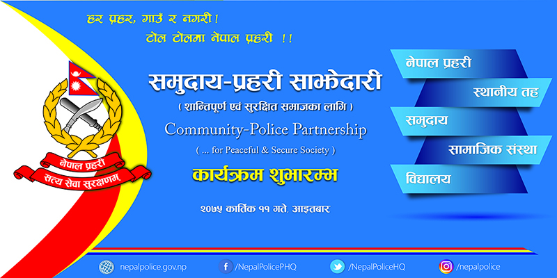 उदयपुर/ जिल्ला प्रहरी कार्यालय उदयपुरले हर प्रहर, गाउँ र नगरी, टोल टोलमा नेपाल प्रहरी भन्ने मुल नाराका साथ समुदाय प्रहरी साझेदारी कार्यक्रम आईतवारबाट सञ्चालन गरेको छ । समाजमा हुने विभिन्न खाले अपराध नियन्त्रणमा प्रहरीको एकल प्रयासबाट मात्रै सम्भव नभएकाले आईतवारदेखि समुदाय–प्रहरी साझेदारी कार्यक्रम सञ्चालनमा गरिएको प्रहरी उपरीक्षक चन्द्रदेव राईले जानकारी दिए ।