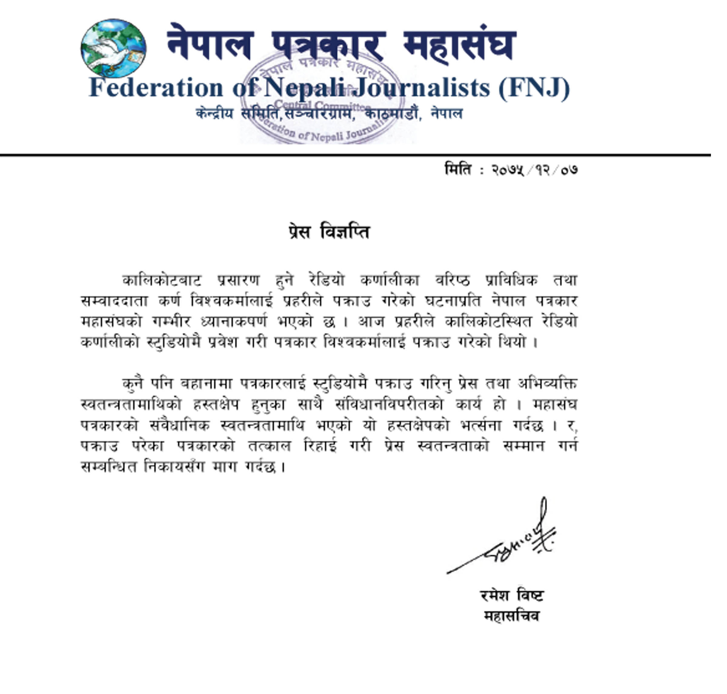 काठमाडौं । कालिकोटबाट प्रसारण हुने रेडियो कर्णालीका वरिष्ठ प्राविधिक तथा सम्वाददाता कर्ण विश्वकर्मालाई प्रहरीले स्टुडियोमै प्रवेश गरी पक्राउ गरेको छ। प्रहरीले कालिकोटस्थित रेडियो कर्णालीको स्टुडियोमै प्रवेश गरी पत्रकार विश्वकर्मालाई पक्राउ गरेको घटनाको नेपाल पत्रकार महासंघले प्रेस तथा अभिव्यक्ति स्वतन्त्रतामाथिको हस्तक्षेप हुनुका साथै संविधान विपरीतको कार्य भनेको छ।