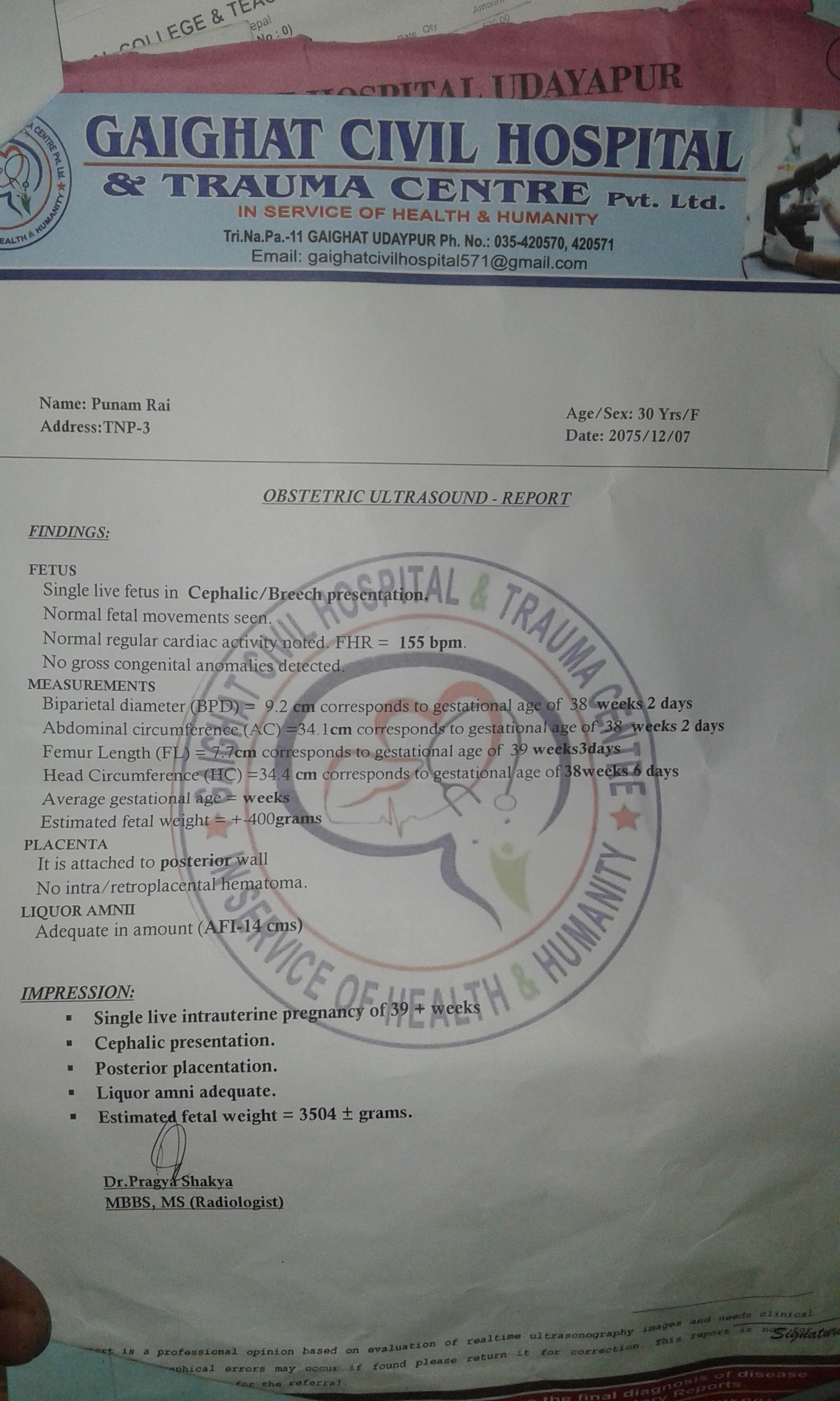 एक महिना अगाडी संचालनमा आएको गाईघाट सिभिल हस्पिटल एण्ड ट्रमा सेन्टर प्रालिमा प्रसूति गराउँदा नवजात शिशु राख्ने सघन कक्षको अभावमा शिशुको ज्यान गएको हो । प्रसूति सेवाका लागि पुनम राई दुई महिना अघिदेखि नै गाईघाटमै आफ्न्तमा रहेदै आएकी थिईन् । उनले गर्भ रहेको चार महिनामा पहिलो पटक त्रियुगा हस्पिटल प्रा.लि. गाईघाटमा भिडियो एक्सरे गरेकी थिईन् । त्रियुगा अस्पतालको डाक्टरले बच्चा जन्मिने समय चैत्र १७–२० गतेको भित्र तोकेको थियो । यस्तै चैत्र ६ गते विश्वास मेडिकल हल प्रा.लि. गाईघाटमा भिडियो एक्सरे गराउँदा त्यहाँका डाक्टरले चैत्र २० गतेको समय सिमा दिइएको थिथो ।