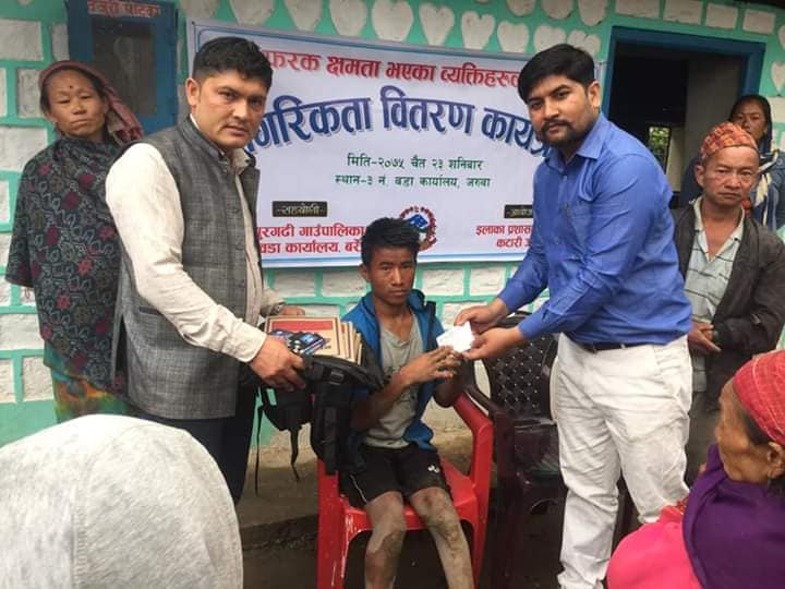 फरक क्षमतालाई नागरिकता शिविर उदयपुरगढी गाउँपालिका ३ बर्रे स्थित जरुवामा भएको थियो । शिविरमा असक्त जेष्ठ नागरिकलाई दोसल्ला र विद्यार्थीहरुलाई स्टेशनरीका सामान समेत वितरण गरेको वडा अध्यक्ष मनोज कार्कीले बताए ।
