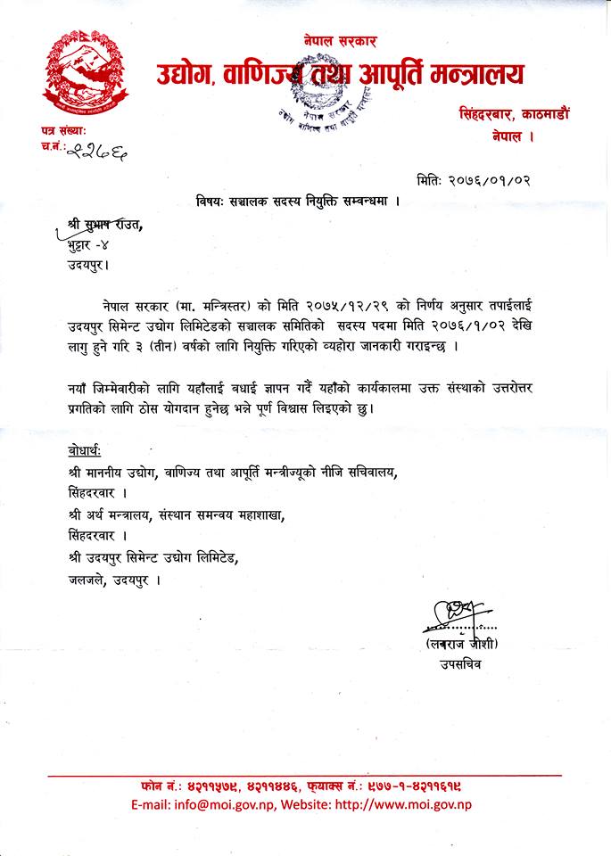 उदयपुर । उदयपुर सिमेन्ट उद्योगको सञ्चालक समितिको सदस्यमा ७ जना नियुक्ति भएका छन् । उद्योगको संचालक समिति सदस्य (वोर्ड मेम्बर) मा सुभाष राउत, पदम दाहाल, सम्झना पाख्रिन, नरेश ढकाल, महेशलाल यादव, देवी बराल र कृष्णचन्द्र मण्डल नियुक्त भएका छन् । राउत, दाहाल र पाख्रिन उदयपुरका हुन भने ढकाल काठमाडौं, यादव धनुषा, बराल इलाम र मण्डल सप्तरीका हुन् । उद्योग बाणिज्य तथा आपूर्ति मन्त्रालयको मन्त्री स्तरको मिति २०७५÷१२÷२९ गतेको निर्णय अनुसार ७ जना संचालक समिति सदस्यको न्युक्ति गरेको हो । संचालक समितिको सदस्यहरुको २०७६ बैशाख २ गतेबाट लागू हुनेगरी ३ वर्षको लागि नियुक्ति गरिएको मन्त्रालयले जनाएको छ ।