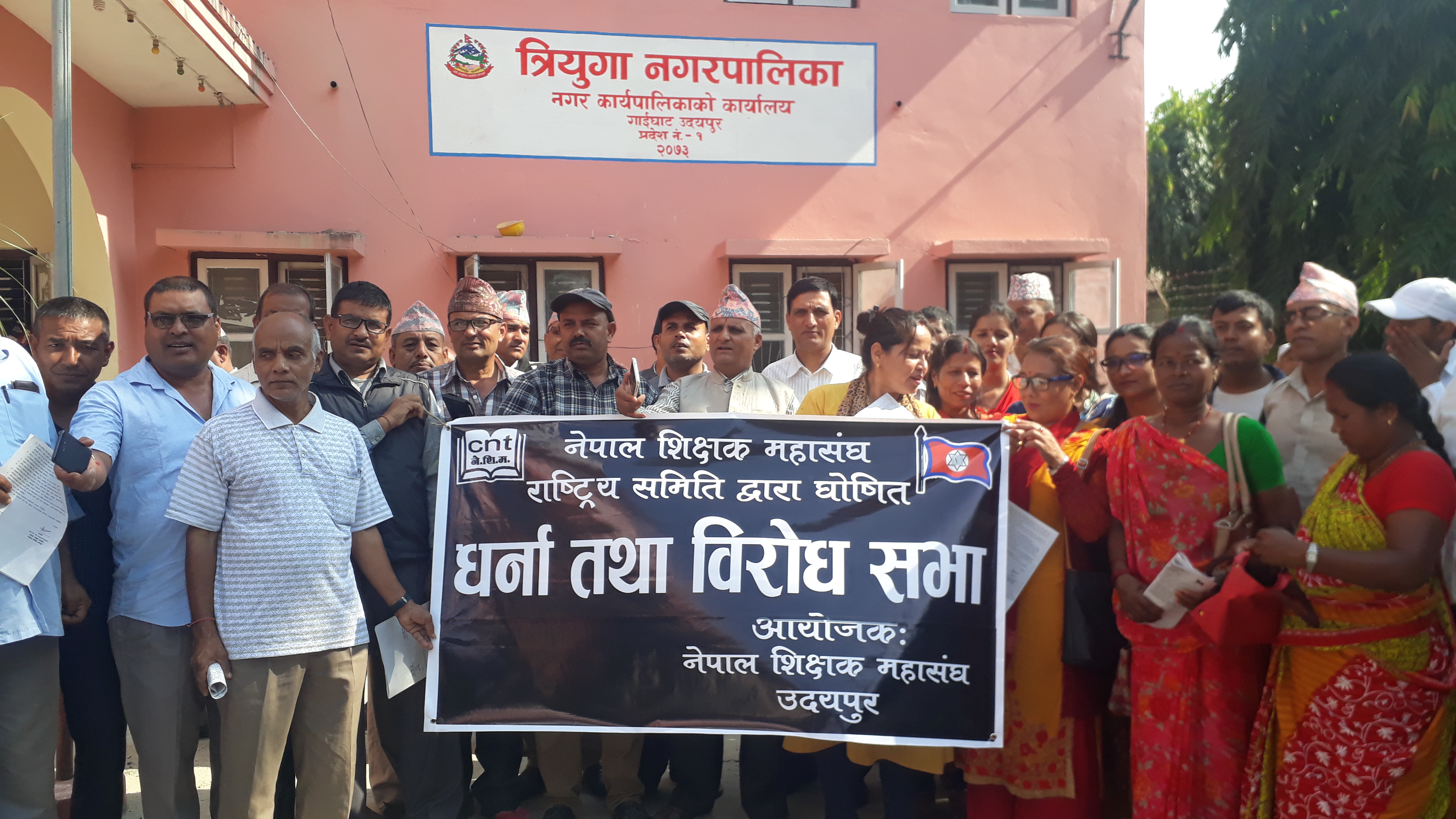 उदयपुर / नेपाल शिक्षक महासंघ उदयपुरले सरकारसंग भएको बिभिन्न माग पुरा गर्न अनुरोध गर्दै शुक्रवार त्रियुगा नगरपालिकाको कार्यालय गाईघाटमा धर्ना दिएका छन् । कार्यालय परिसरमा सामुदायिक बिद्यालयका शिक्षक शिक्षिकाहरुले शुक्रवार दिउँसो १ बजेदेखि ३ बजे सम्म दुई घण्टा धर्ना दिएका हुन ।