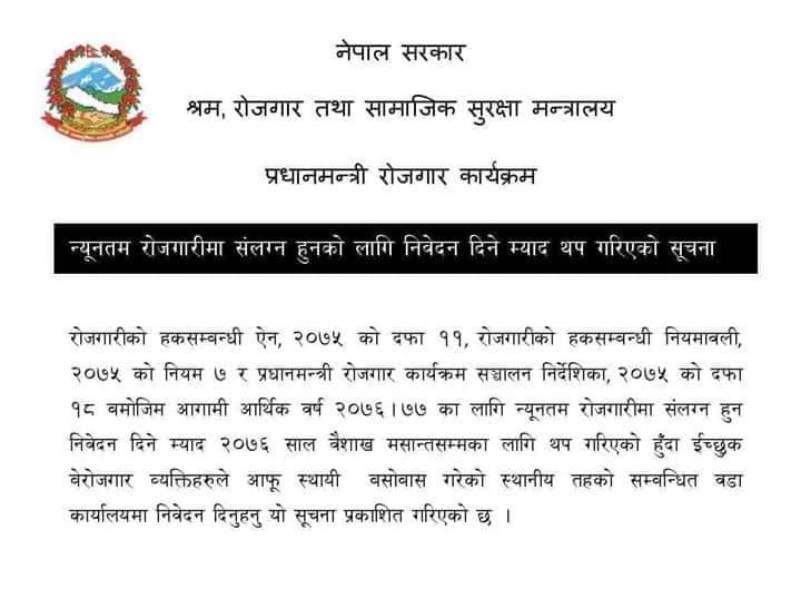 काठमाण्डौ – सरकारले रोजगारीका लागि निवेदन दिने समय एक महिनाको समय थप गरेको छ । यसअघि दिएको चैत मसान्तसम्मको म्याद सकिएपछि वैशाख मसान्तसम्मको समय थप गरेको हो ।