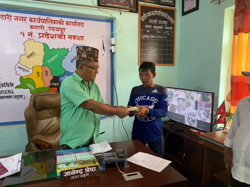 उदयपुर । उदयपुरको कटारी नगरपािलकाले आग्नी पीडितलाई ९० हजार नगद सहयोग गरेको छ । गत चैत्र १ गते कटारी नगरपालिका १० बेसी गाउँ बस्ने शेरबहादुर सुनुवार, धनबहादुर सुनुवार र विचारी सुनुवारको घर जलेर नष्ट भएको थियो । अग्नी पीडितहरुलाई नगरपालिकामै बोलाएर ९० हजार राहत रकम वितरण गरिएको हो ।