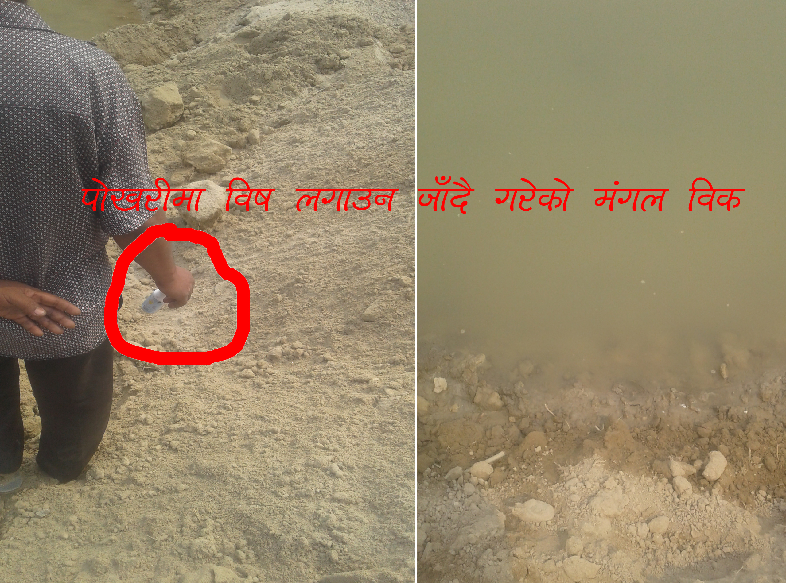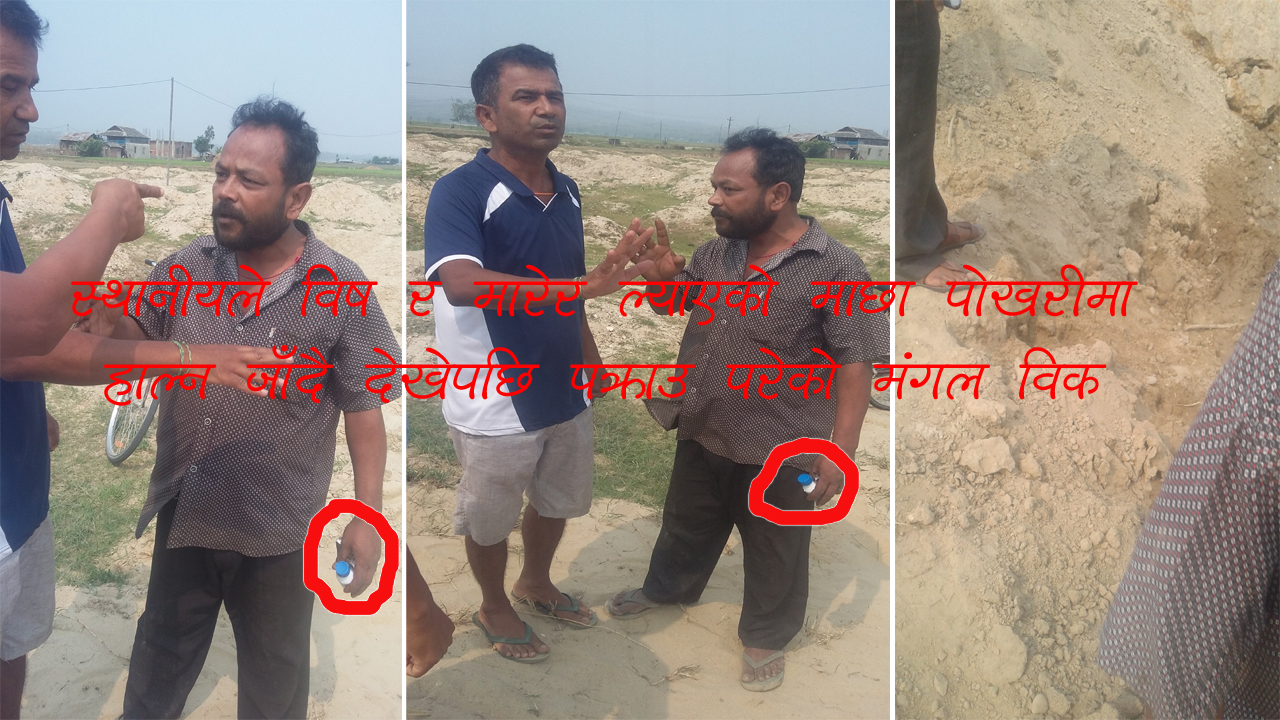 यस विषयमा प्रहरी निरीक्षक अम्मर गजमेरसँग बुझ्दा सन्तोषले विहिबार मेरो पोखरीमा विष लगाई दिएको भन्दै आएको थियो र एउटा मरेको माछा र विषको बट्टा लिएर आएको स्वीकार गरे । पोखरी धनीले ल्याएको मरेको माछा र विषको ल्याव टेष्ट गर्नु पर्छ भन्दै राख्न लगाएको स्वीकार गरे । उनले भने, ‘घटना प्रकृति मुचुल्का उठाउन जाँदा आफुहरुले सन्तोष स्वर्णकार र उनका कालीगढ मंगल विकलाई कुनै पनि विष र मरेको माछा दिएको थिएनौं, सन्तोषको आरोप झुठो हो ।’